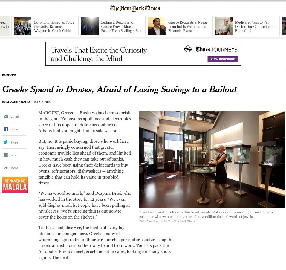 Οπως μεταφέρει στο ρεπορτάζ η δημοσιογράφος των Times της Νέας Υόρκης, «η αύξηση της αγοράς συσκευών, αλλά και κοσμημάτων, αλλά και η αποπληρωμή των φόρων είναι ένας τρόπος να προστατευτούν από ενδεχόμενη απώλεια των καταθέσεών τους σε περίπτωση που χρεοκοπήσουν οι τράπεζες, όπως έγινε και με τους καταθέτες στην Κύπρο».