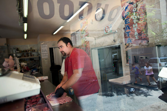 Ο Θοδωρής Ρούσσος στέκεται στο χασάπικό του και δείχνει ένα μεγάλο φορτηγό έξω. Για μήνες ανέβαλε την αντικατάσταση των ελαστικών, γιατί η οικονομική κρίση είχε «ρίξει» τη δουλειά του. Πρόσφατα όμως, απέκτησε ένα σετ καλών ελαστικών, σε ασυναγώνιστη τιμή. «Συνήθως, κοστίζουν 340 ευρώ, αλλά δεν υπήρχε ανταλλαγή χρημάτων. Τον πλήρωσα σε κρέας», λέει.