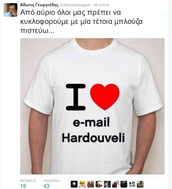 Λευκό μπλουζάκι με στάμπα «I Love e-mail Hardouveli», λανσάρει στον προσωπικό του λογαριασμό στο twitter ο Αδωνις Γεωργιάδης.