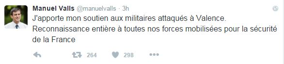Με ανάρτησή του στον λογαριασμό του στο Twitter ο κ. Βαλς σχολίασε την επίθεση που δέχτηκαν στρατιώτες στο τέμενος της Βαλάνς, στη νοτιοανατολική, όταν ένας άνδρας προσπάθησε να τους παρασύρει με το αυτοκίνητό του.
