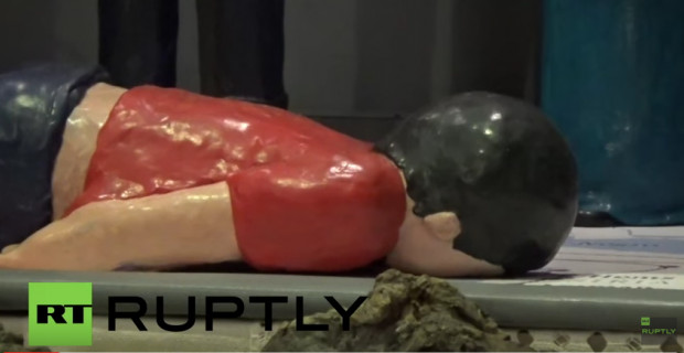 Το τρίχρονο αγοράκι που πνίγηκε στις ακτές της Αλικαρνασσού στις αρχές του περασμένου Σεπτεμβρίου και συγκλόνισε με τον θάνατο του ολόκληρο τον πλανήτη είναι ξαπλωμένος στη φάτνη ενώ από πάνω του γεμάτοι πόνο και οδύνη στέκονται οι γονείς του.