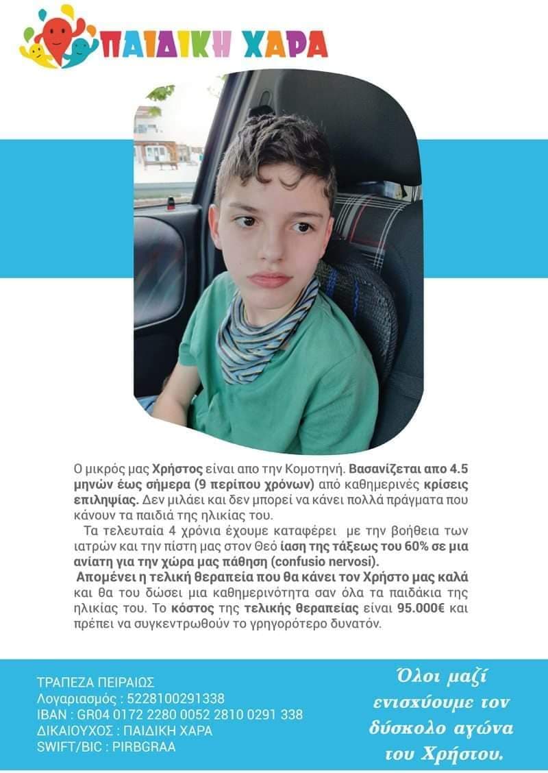 Ας δώσουμε στον Χρήστο την Ευκαιρία του. Ο μικρός μας Χρήστος είναι από την Κομοτηνή. Βασανίζεται από 4.5 μηνών έως σήμερα (9 περίπου χρόνων) από καθημερινές κρίσεις επιληψίας.