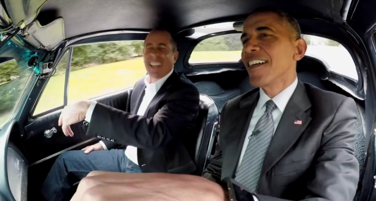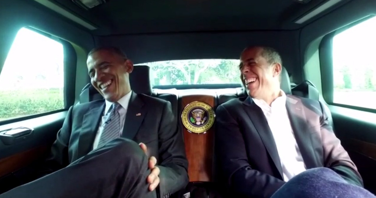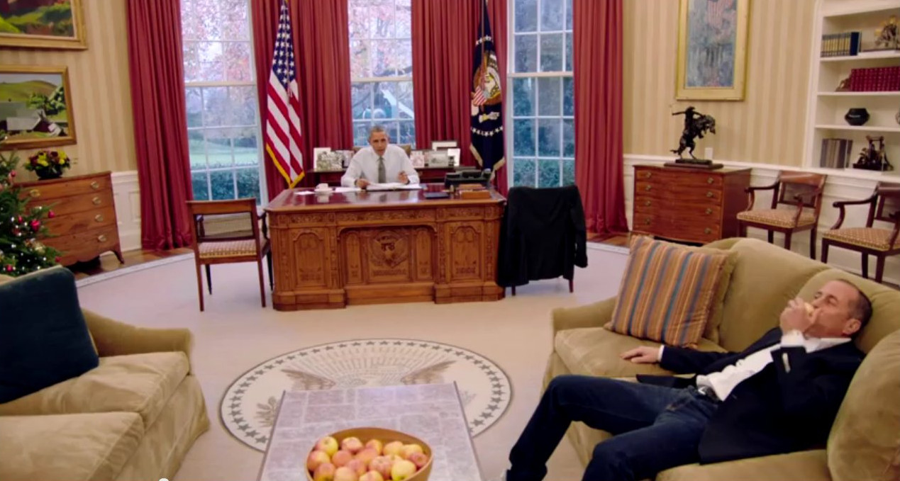 Ο ηθοποιός Jerry Seinfeld, που φιλοξένησε για πρώτη φορά έναν πολιτικό στην εκπομπή του, μπήκε στην προεδρική λιμουζίνα και μπήκε στα άδυτα του Λευκού Οίκου, ξάπλωσε στον καναπέ του οβάλ γραφείου τρώγοντας… μήλο.