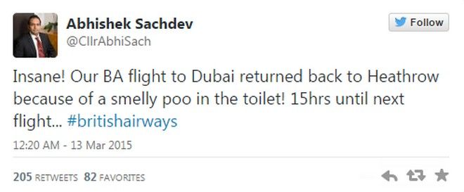 Όπως αναφέρεται, μια μυρωδιά εξαπλώθηκε γρήγορα στον χώρο του αεροπλάνου και έκανε την ατμόσφαιρα ανυπόφορη. Οι αεροσυνοδοί προσπαθούσαν να εντοπίσουν αρχικά αν πρόκειται για κάποια μηχανική βλάβη αλλά τελικά κατάλαβαν πως η δυσοσμία προερχόταν από την τουαλέτα. Έτσι μιας και το ταξίδι είναι πολύωρο, ο πιλότος προτίμησε να γυρίσουν πίσω, παρά να υφίστανται επιβάτες και προσωπικό τη μυρωδιά.Το γεγονός επιβεβαιώνουν τόσο τα βρετανικά μέσα ενημέρωσεις όσο και τα tweet των επιβατών.