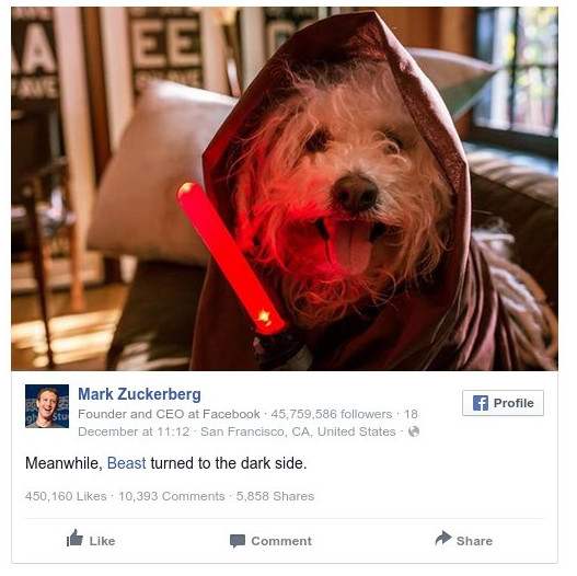 Μετά τις φωτογραφίες της νεογέννητης κόρης του, σειρά είχε το ουγγρικό τσοπανόσκυλο του Μαρκ Ζούκερμπεργκ να ακολουθήσει την παγκόσμια φρενίτιδα για την νέα ταινία του «Πολέμου των Άστρων» ξετρελαίνοντας τους θαυμαστές του στο διαδίκτυο.