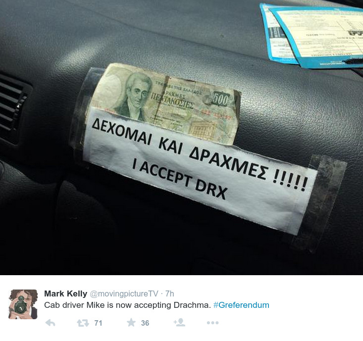 Ωρες πριν κλείσουν οι κάλπες, ένας Ελληνες ταξιτζής έμοιαζε σίγουρος για το αποτέλεσμα του σημερινού δημοψηφίσματος. Και είχε βάλει ήδη ταμπέλα πως δέχεται και… δραχμές.