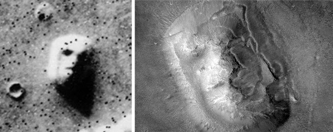 Ήταν στη δεκαετία του 1970 όταν η NASA εκτόξευσε τα δύο διαστημόπλοια Viking 1 και Viking 2 σε αποστολή στον Κόκκινο Πλανήτη. Αμφότερα κατέγραψαν εικόνες της επιφάνειας του Άρη και τις ξαπέστειλαν στη NASA και σε μία από αυτές ένας αρειανός λόφος εμφανιζόταν με ανθρώπινο πρόσωπο! Κι αν από μακριά φαινόταν να μοιάζει πράγματι με πρόσωπο, για τους συνωμοσιολόγους ήταν πρόσωπο: ο διαβόητος Richard Hoagland πήγε το πράγμα στα άκρα του όταν επιχειρηματολόγησε για την ύπαρξη αρειανού πολιτισμού, παραθέτοντας το πρόσωπο ως απόδειξη εξωγήινης πόλης. Σε άλλες πάλι φωτογραφίες του ίδιου λόφου φαινόταν απλώς ένα διαβρωμένο οροπέδιο, αν και πάλι η NASA ήταν αυτή που «πείραξε» τις κατοπινές απεικονίσεις για να κρύψει τα ίχνη της αρειανής δραστηριότητας. Σήμερα βέβαια που το Curiosity οργώνει την επιφάνεια του Κόκκινου Πλανήτη το «πρόσωπο» αποδεικνύεται ότι είναι μια ψευδαίσθηση που δημιουργείται από το παιχνίδισμα του φωτός και της σκιάς, όπως εξάλλου συμβαίνει πολλάκις και στη Γη, με τα πρόσωπα στα σύννεφα και τα βουνά. Ή πάλι και όχι…