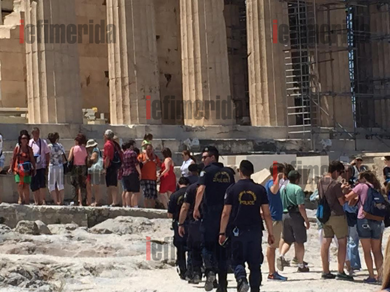 Ντου στην Ακρόπολη έκανε νωρίτερα ομάδα της Νεολαίας του ΣΥΡΙΖΑ και μέλη της ΑΝΤΑΡΣΥΑ με σκοπό να αναρτήσουν στον ιερό βράχο της Ακρόπολης πανό υπέρ του «Οχι».