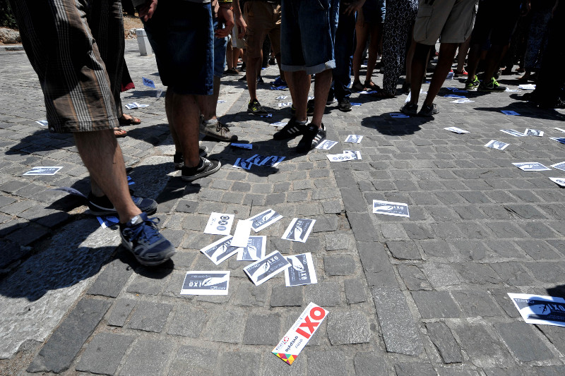 Απτόητοι, συνέχισαν τη μίνι διαδήλωσή τους υπέρ του «όχι«» στον πεζόδρομο της Διονυσίου Αεροπαγίτου συνθήματα υπέρ του «Όχι» στο δημοψήφισμα και πετώντας φέιγ βολάν.