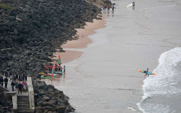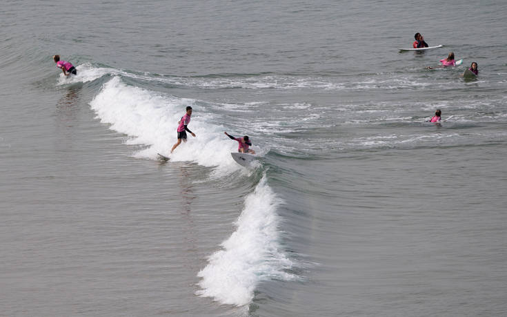 «Είναι η ιδανική στιγμή για να μάθετε σήμερα το άθλημα!» τους είπε στα αγγλικά η Πολίν Αντό, μια 28χρονη, επαγγελματίας σέρφερ, η οποία τους παρουσίασε και «φιλικές προς το περιβάλλον» στολές του σερφ.