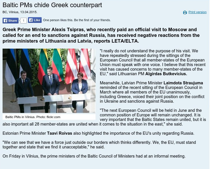 Η online έκδοση της «The Baltic Course», με τίτλο «Οι πρωθυπουργοί των χωρών της Βαλτικής ”κατσαδιάζουν” τον Ελληνα ομόλογό τους», φιλοξενεί δηλώσεις των πρωθυπουργών.