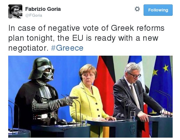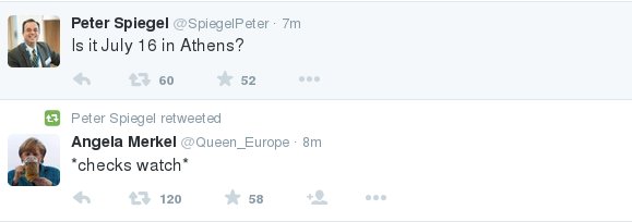 Την αρχή έκανε ο Πίτερ Σπίγκελ, αναδημοσιεύοντας ανάρτηση σε ψεύτικο λογαριασμό με το όνομα Ανγκελα Μέρκελ, στην οποία αναφερόταν ότι η Καγκελάριος κοιτάζει το ρολόι της. Λίγα λεπτά αργότερα, ο δημοσιογράφος των Financial Times αναρωτήθηκε «Είναι 16 Ιουλίου στην Αθήνα;».