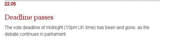Στο ίδιο πνεύμα και η Telegraph. «Η διορία για την ψηφοφορία στα μεσάνυχτα ήρθε και πέρασε, καθώς η συζήτηση συνεχίζεται στη βουλή».