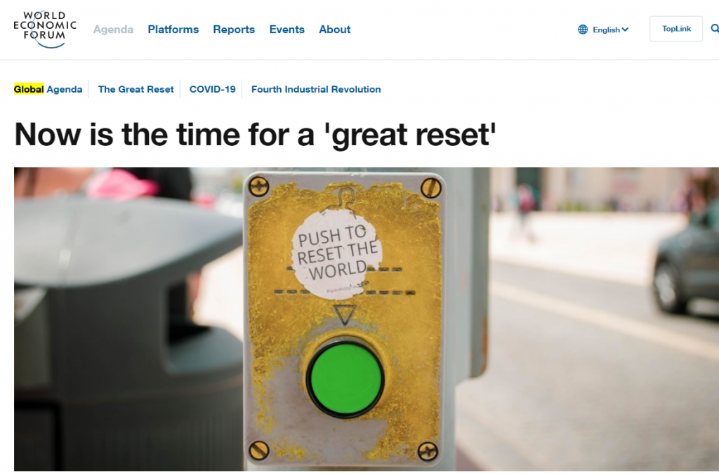 Το σχέδιο «Great Reset» έχει εκπονηθεί από τους διεθνιστές του Παγκόσμιου Οικονομικού Φόρουμ (WEF) και επιδιώκει να πατηθεί το κουμπί επανεκκίνησης στην παγκόσμια οικονομία, αντικαθιστώντας το καπιταλιστικό σύστημα με «σύγχρονα σοσιαλιστικά συστήματα»: ένας μεταμοντέρνος Νέο-Κομμουνισμός με την βοήθεια της τεχνολογίας, βασισμένος στην «Νέα Πράσινη Νέα Συμφωνία» της Ατζέντας 2030.