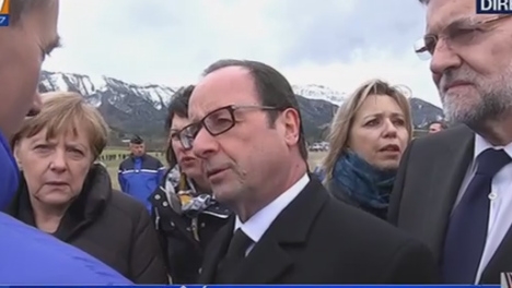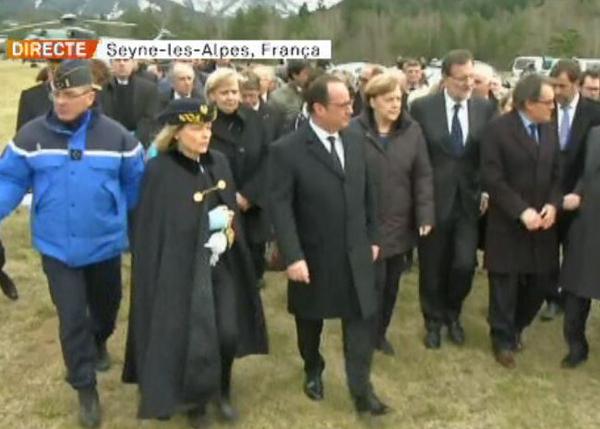 Στο σημείο της αεροπορικής τραγωδίας στις Αλπεις που έχει προκαλέσει παγκόσμιο σοκ βρέθηκαν γύρω στις 3 το μεσημέρι, ώρα Ελλάδος, ο Γάλλος πρόεδρος Φρανσουά Ολάντ, η Γερμανίδα καγκελάριος Ανγκελα Μέρκελ και ο Ισπανός πρωθυπουργός Μαριάνο Ραχόι.
