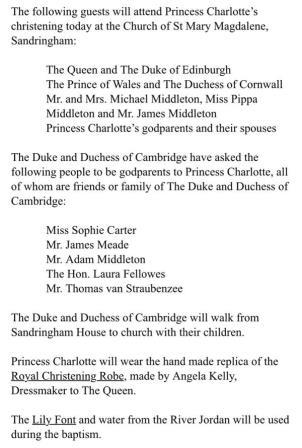 Η βάπτιση θα γίνει στις 16:30 το απόγευμα στο Ναό της Αγίας Μαρίας της Μαγδαληνής στο Σάντριγκχαμ, όπου και βαπτίστηκε η πριγκίπισσα Νταϊάνα τον Αύγουστο του 1961. Τη βάπτιση θα τελέσει ο αρχιεπίσκοπος Καντερμπούρι.