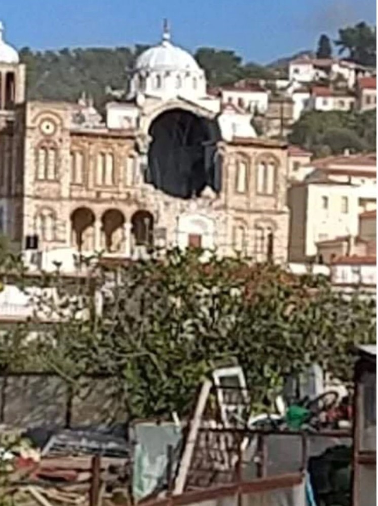 Από τον ισχυρό σεισμό προκλήθηκαν εκτεταμένες ζημιές στην κεντρική εκκλησία στο Καρλόβασι καθώς κατέρρευσε ολόκληρο τμήμα της. Όπως βλέπετε λείπει ολόκληρο τμήμα της εκκλησίας της Παναγίας της Θεοτόκου λείπει.