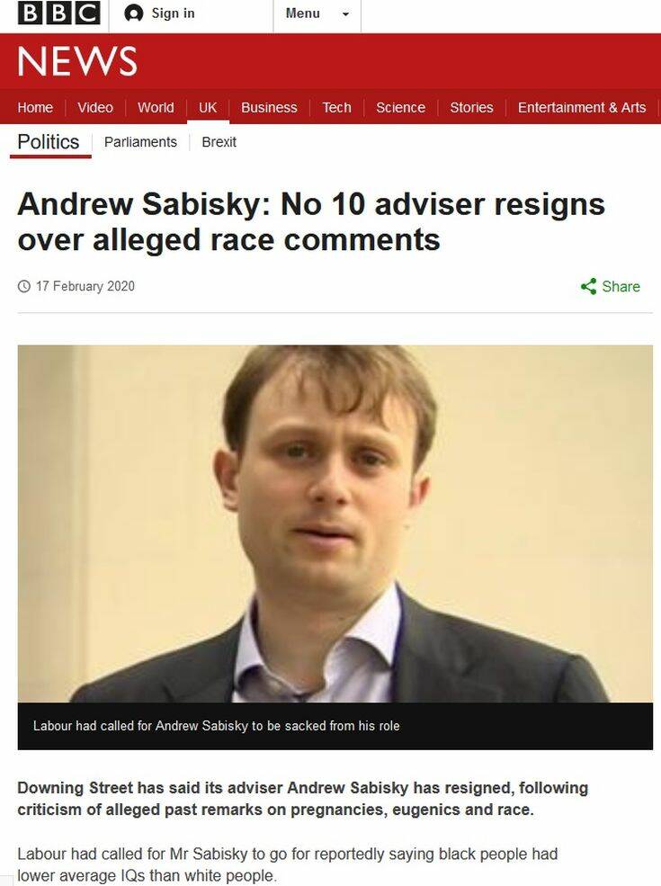 Ο Sabisky παραιτήθηκε μετά την οργή που προκάλεσαν οι ρατσιστικές τοποθετήσεις του για τους μαύρους και τη σημασία της αντισύλληψης.