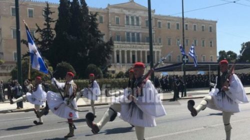 Με το… απαγορευμένο Μακεδονία Ξακουστή η μεγάλη στρατιωτική παρέλαση στην Αθήνα για τον εορτασμό της 25ης Μαρτίου, την ώρα που στη Θεσσσαλονίκη σημειωνόταν ένταση στη μαθητική παρέλαση.