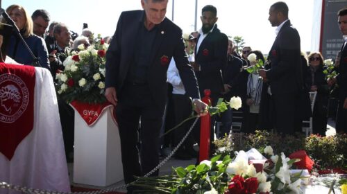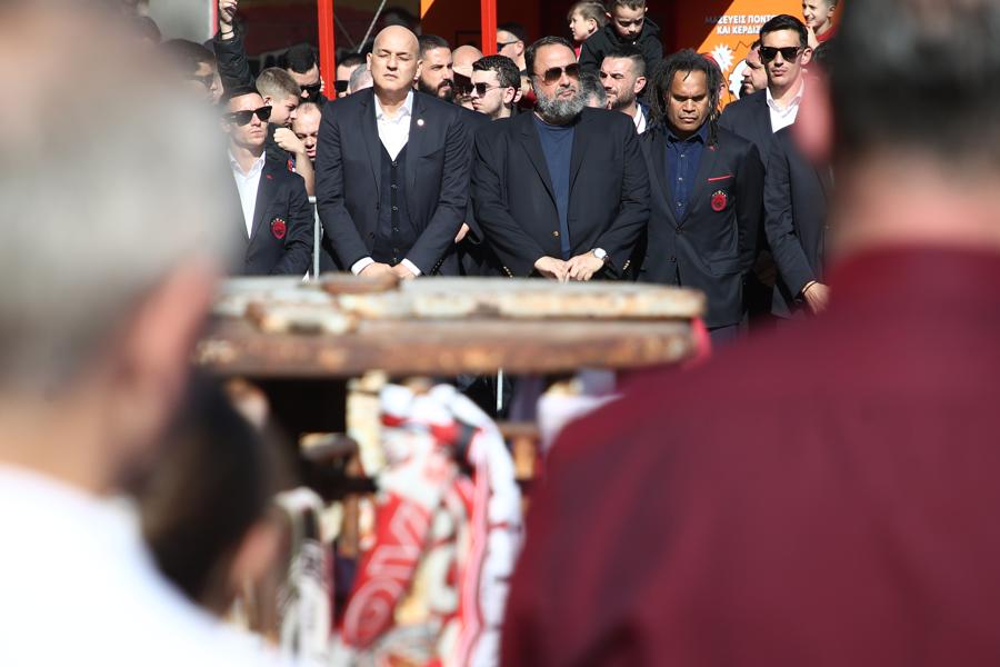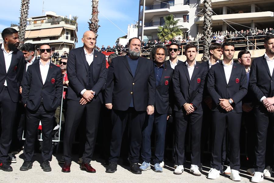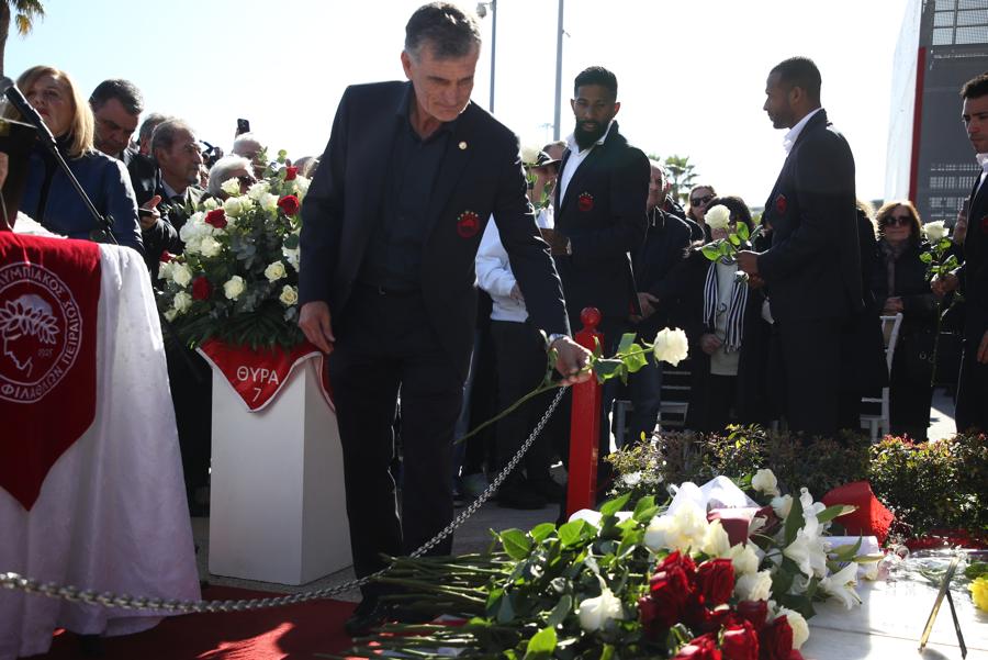 Δεν έλειψε κανείς. Η διοίκηση, με μπροστάρη τον Βαγγέλη Μαρινάκη, οι προπονητές, οι παίκτες που φορούν τη φανέλα με τον δαφνοστεφανωμένο έφηβο, όλοι ήταν εκεί για να τιμήσουν τη μνήμη των 21 παιδιών που χάθηκαν στα σκαλοπάτια.