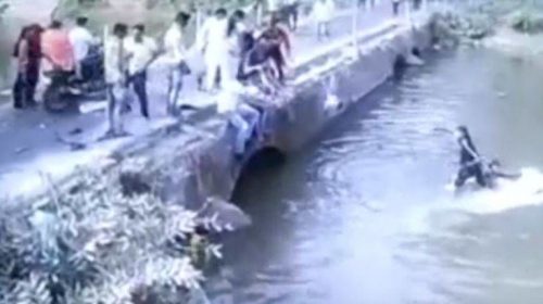 Ο πατέρας έβγαλε το παιδί από το όχημα και προσπάθησε με δύναμη να το πετάξει για να το πιάσουν όσοι βρίσκονταν πάνω στην πέτρινη γέφυρα. Δυστυχώς το πέταγμά του δεν έγινε με αρκετή δύναμη και το παιδί κατέληξε στο νερό. Αμέσως ο πατέρας και κάποιοι περαστικοί έπεσαν στο νερό για να σώσουν το μικρό.
