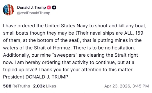 «Έχω διατάξει το Πολεμικό Ναυτικό των ΗΠΑ να πυροβολεί και να καταστρέφει κάθε σκάφος, όσο μικρό κι αν είναι (τα πολεμικά τους πλοία βρίσκονται ΟΛΑ, και τα 159, στον βυθό!), που τοποθετεί νάρκες στα νερά του Ορμούζ. Δεν πρέπει να υπάρχει κανένας δισταγμός. Επίσης, τα ναρκαλιευτικά μας αυτή τη στιγμή καθαρίζουν τα Στενά. Διατάζω να συνεχιστεί η δουλειά, αλλά σε τριπλάσιο ρυθμό!» έγραψε συγκεκριμένα ο Αμερικανός πρόεδρος.
