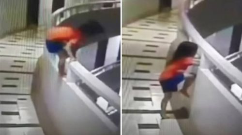 Όπως δείχνει το βίντεο από κάμερα ασφαλείας που κατέγραψε το σοκαριστικό περιστατικό, η 5χρονη περπατά στον διάδρομο ξενοδοχείου και πηγαίνει προς τα προστατευτικά κάγκελα.