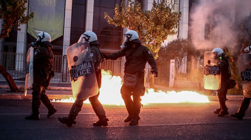 Σύμφωνα με την ΕΛΑΣ, διαδηλωτές επιτέθηκαν με μολότοφ, πέτρες και άλλα αντικείμενα σε αστυνομικές δυνάμεις που βρίσκονταν στο σημείο, ενώ έβαλαν φωτιά σε κάδους απορριμμάτων. Οι αστυνομικές δυνάμεις από την πλευρά τους, προσπάθησαν να απωθήσουν τους διαδηλωτές.