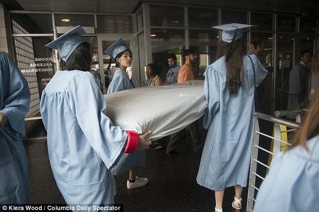 Για όσους γνωρίζουν την υπόθεση, η παρουσία του στρώματος κατά τη διάρκεια της τελετής δεν ήταν κάτι απροσδόκητο. Καιρό τώρα, αποτελούσε μέρος της εργασίας της Έμα Σάλκοβιτς, της φοιτήτριας που το 2013 υποστήριξε ότι ένας συμφοιτητής της, ο Γερμανός Πολ Νάνγκεσερ, τη βίασε αμέσως μετά το μάθημα, στον κοιτώνα της.