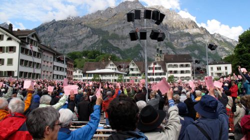 Ταυτοχρόνως, υπάρχουν και δυο καντόνια (Απενζέλ Ινερχόντεν και Γκλάρους) όπου η λαϊκή συνέλευση (Landsgemeinde) συνεχίζει να εκλέγει τους αντιπροσώπους της δι’ ανατάσεως της χειρός! Μερικές χιλιάδες πολίτες συρρέουν για να αποφασίσουν για το παρόν και το μέλλον τους και χωρίς τη μυστικότητα μάλιστα του παραβάν. Το παμπάλαιο αυτό σύστημα αμεσοδημοκρατικής ψηφοφορίας έχει και τα υπέρ και τα κατά του, όσο το θέλει όμως ο λαός δεν πέφτει σε κανέναν λόγος. Αν σταματήσει εξάλλου να το θέλει, θα το αλλάξει. Με την ίδια ανάταση του χεριού…