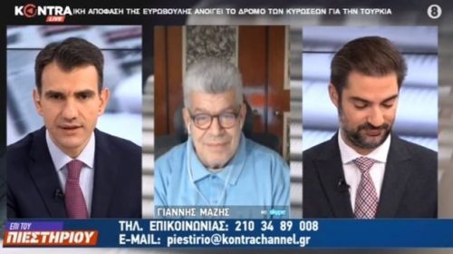 Ο Δρ Ιωάννης Μάζης, Καθηγητής Οικονομικής Γεωγραφίας και Γεωπολιτικής στο Πανεπιστήμιο Αθηνών και Πρόεδρος του Τμήματος Τουρκικών Σπουδών και Σύγχρονων Ασιατικών Σπουδών, μίλησε για το τουρκικό πρόβλημα στην εκπομπή «ΕΠΙ ΤΟΥ ΠΙΕΣΤΗΡΙΟΥ» με τoν Γιώργο Σιαδήμα και τον Αλέξανδρο Κλώσσα στο Kontra Channel.