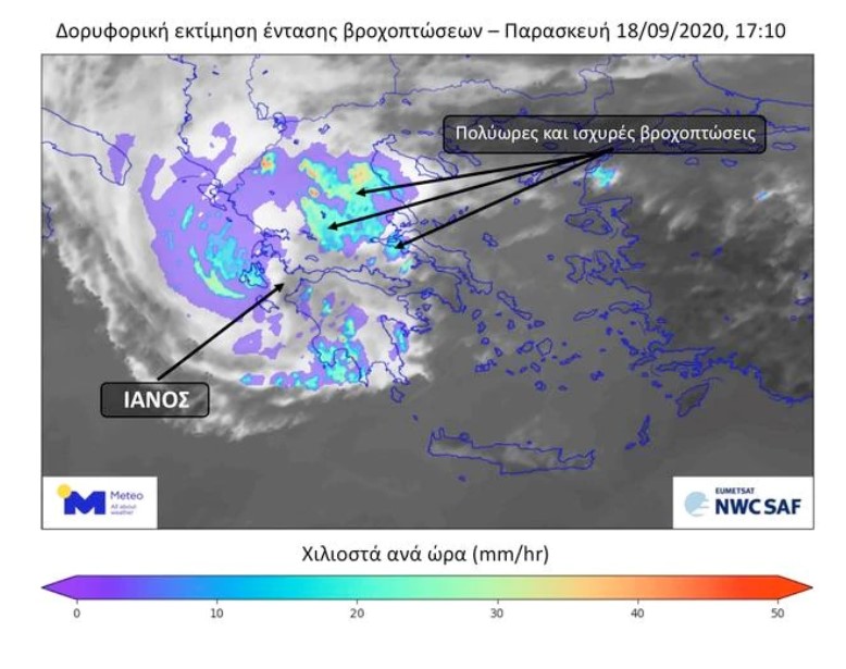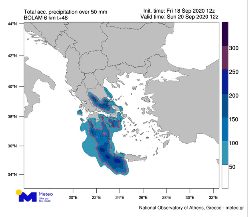 Πιο αναλυτικά, το Σάββατο 19 Σεπτεμβρίου 2020 στο Νότιο Ιόνιο και κυρίως στα ανατολικά και νότια ηπειρωτικά τμήματα, στην Εύβοια, στις Δυτικές Κυκλάδες και στη Δυτική Κρήτη αναμένονται τοπικά πολύ ισχυρές βροχοπτώσεις και σποραδικές καταιγίδες. Τα φαινόμενα κατά τη διάρκεια της ημέρας θα μετατοπίζονται νοτιότερα και τα βράδυ θα περιοριστούν στη Νότια Πελοπόννησο και τη Δυτική Κρήτη.