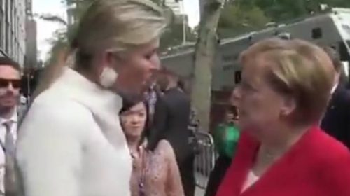 Queen Maxima of The Netherlands explains to German Chancellor Merkel in New York she recently spoke to France about women’s rights.