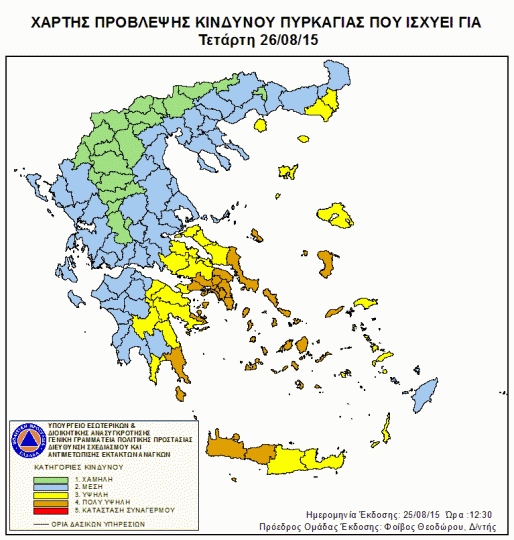 Πολύ υψηλός κίνδυνος πυρκαγιάς προβλέπεται για σήμερα Τετάρτη 26 Αυγούστου 2015, σύμφωνα με το Χάρτη Πρόβλεψης Κινδύνου Πυρκαγιάς που εκδίδει η Γενική Γραμματεία Πολιτικής Προστασίας του Υπουργείου Εσωτερικών & Διοικητικής Ανασυγκρότησης (www.civilprotection.gr).