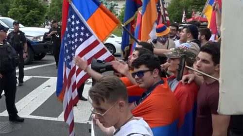 Οι διαδηλωτές, όμως, βρέθηκαν αντιμέτωποι με αντισυγκέντρωση τουρκικών οργανώσεων που ήταν παρατεταγμένες περιμετρικά της κατοικίας του Τούρκου πρέσβη στην Ουάσινγκτον. Οι αρμενο-αμερικανικές οργανώσεις βρίσκονταν στον ακριβώς απέναντι κυκλικό κόμβο. Πρόκειται για το ίδιο σημείο στο οποίο πριν από δύο χρόνια οι άνδρες της ασφάλειας του Πρόεδρου Ερντογάν είχαν επιτεθεί εναντίον Κούρδων διαδηλωτών. Λόγω του συγκεκριμένου περιστατικού, η αστυνομία της Ουάσινγκτον είχε λάβει ισχυρά μέτρα ασφαλείας.