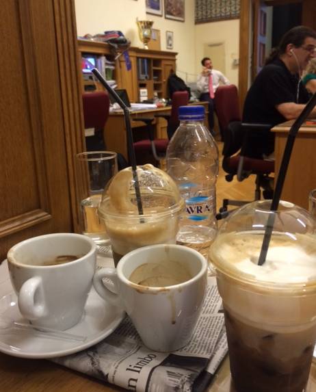 Η Telegraph δημοσίευσε μία φωτογραφία που τράβηξε ο ρεπόρτερ της, ο οποίος έχει τέσσερις καφέδες μπροστά του στην αίθουσα τύπου της ελληνικής βουλής. «Ευτυχώς, έχει αρκετά συμπληρώματα για να τον κρατήσουν», σχολιάζει η βρετανική εφημερίδα.