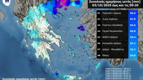 Από τις μετρήσεις των αυτόματων μετεωρολογικών σταθμών προκύπτει ότι μέχρι τις 9:20 το πρωί της Παρασκευής, το μεγαλύτερο ύψος βροχόπτωσης καταγράφηκε στο Παρανέστι της Δράμας, όπου έπεσαν 90 χιλιοστά νερό.