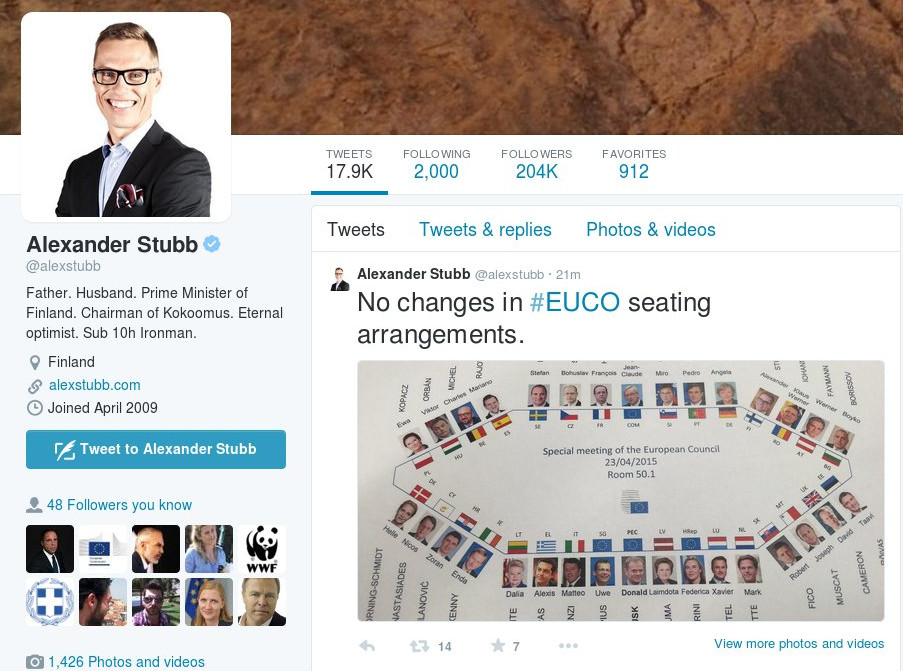Ο Φιλανδός πρώην πρωθυπουργός ηττήθηκε από τον Γιούχα Σιπίλα πριν λίγες ημέρες και αυτή είναι η τελευταία του παρουσία σε Σύνοδο Κορυφής.