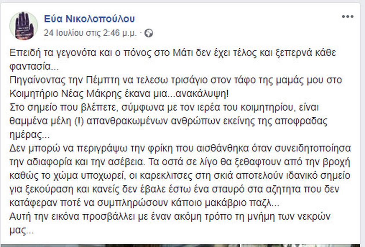 Σύμφωνα με την ανάρτηση στο Facebook της εν λόγω κυρίας, επισκέφτηκε το Κοιμητήριο της Νέας Μάκρης προκειμένου να τελέσει τρισάγιο στο τάφο της μητέρας της. Ωστόσο η ανακάλυψη που έκανε στο σημείο προκαλεί ανατριχίλα.