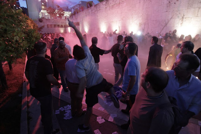 Την στιγμή εκείνη επικράτησε ένταση, με τους συγκεντρωμένους να τους αποδοκιμάζουν έντονα, ενώ εκείνοι έριξαν και φωτοβολίδες προς τους διαδηλωτές…μεταξύ των συγκεντρωμένων σημειώθηκε μικροένταση και λεκτική αντιπαράθεση.