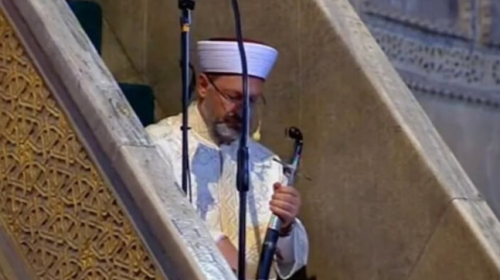 Υποβασταζόμενος από ένα οθωμανικό ξίφος ανέβηκε στον άμβωνα της Αγίας Σοφίας ο ανώτατος ιμάμης και πρόεδρος της αμφιλεγόμενης Αρχής Θρησκευτικών Υποθέσεων της Τουρκίας, Αλί Ερμπάς.