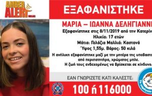 Στις 08/11/2019, και ώρα 14:00 μ.μ., εξαφανίστηκε από την Κατερίνη, η Μαρία – Ιωάννα Δεληγιάννη, 17 ετών. «Το Χαμόγελο του… [13 Νοεμβρίου, 2019 - 19:45]