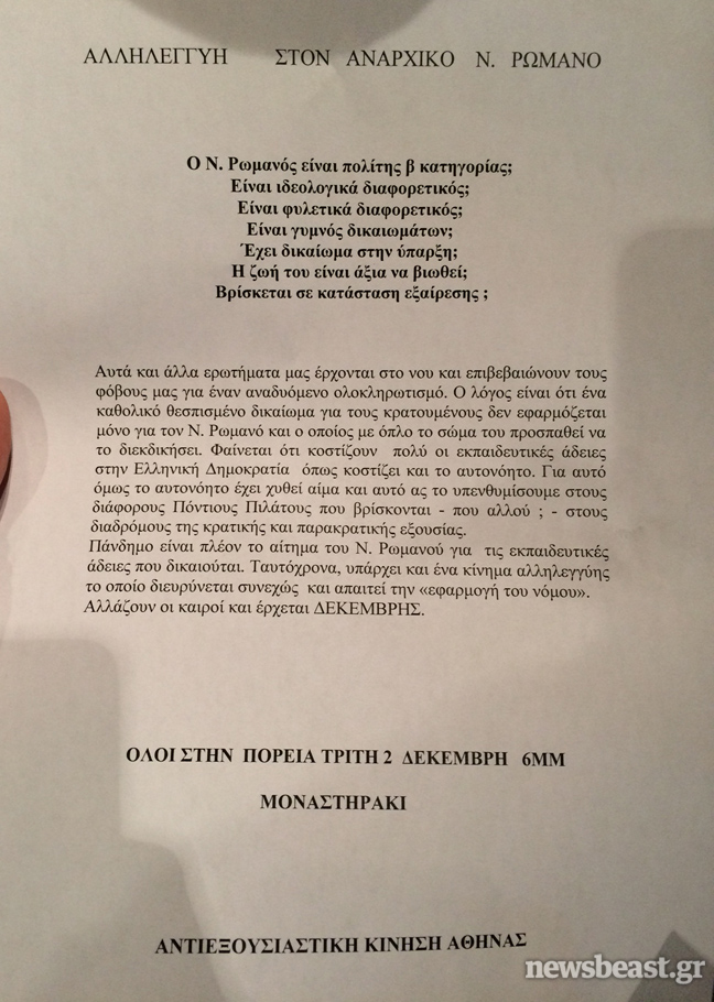 Σημειώνεται ότι σήμερα αναμένεται η τελική απόφαση από το Δικαστικό Συμβούλιο Πειραιά για το κατά πόσο θα χορηγηθεί φοιτητική άδεια στον απεργό πείνας, Νίκο Ρωμανό. Ο εισαγγελέας έχει απορρίψει το αίτημα για τη χορήγηση της σχετικής άδειας. «Η απόφαση του Συμβουλίου Πλημμελειοδικών Πειραιά ουσιαστικά θα κρίνει και το κατά πόσο ο Νίκος Ρωμανός θα παραμείνει στη ζωή», σχολίασε ο δικηγόρος του Φραγκίσκος Ραγκούσης.