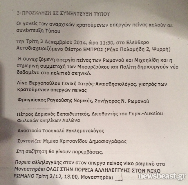 Συνέντευξη τύπου θα δώσουν σε λίγη ώρα οι γονείς των απεργών πείνας, Νίκου Ρωμανού και Γιάννη Μιχαηλίδη στο Ελεύθερο Αυτοδιαχειριζόμενο Θέατρο Εμπρός.