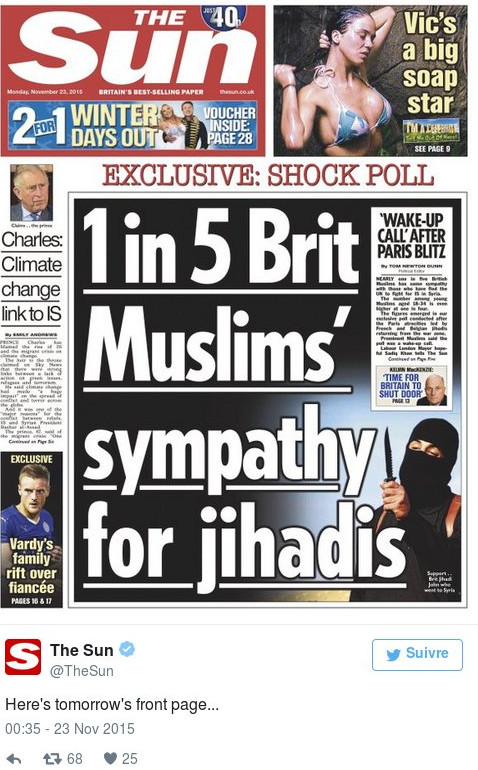 Οι μουσουλμάνοι της Βρετανίας, μετά το δημοσίευμα της Sun, έσπευσαν να ειρωνευθούν τις προκαταλήψεις για τη θρησκεία τους, σχολίασαν γελώντας ή απάντησαν με εικόνες χρησιμοποιώντας το hashtag #1in5Muslims. Τα χαρακτηριστικά ενδύματα, οι θρησκευτικές πεποιθήσεις και οι δημοσκοπήσεις όλα σχολιάστηκαν.