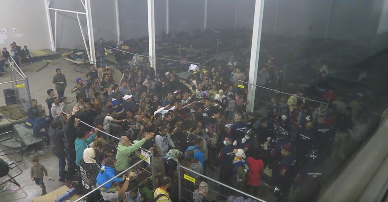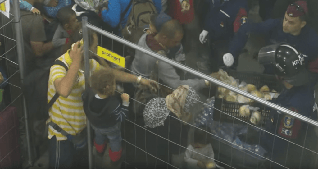 Το βίντεο αυτό, το οποίο γυρίστηκε κρυφά την Τετάρτη από μια Αυστριακή εθελόντρια μέσα στον καταυλισμό του Ρόζκε, δείχνει περίπου 150 πρόσφυγες που έχουν συγκεντρωθεί σε έναν περιφραγμένο χώρο μέσα σε μια μεγάλη αίθουσα και σπρώχνονται για να πιάσουν τα σακουλάκια με τα σάντουϊτς που τους πετούν Ούγγροι αστυνομικοί με κράνη και μάσκες υγιεινής.