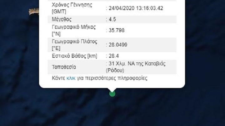 Συγκεκριμένα σύμφωνα με το Γεωδυναμικό το επίκεντρο του σεισμού ήταν σε θαλάσσια περιοχή 31 χλμ νοτιοανατολικά της Καταβιάς Ρόδου, ενώ το εστιακό βάθος υπολογίζεται σε 28,4 χλμ.