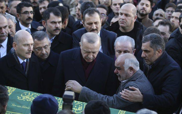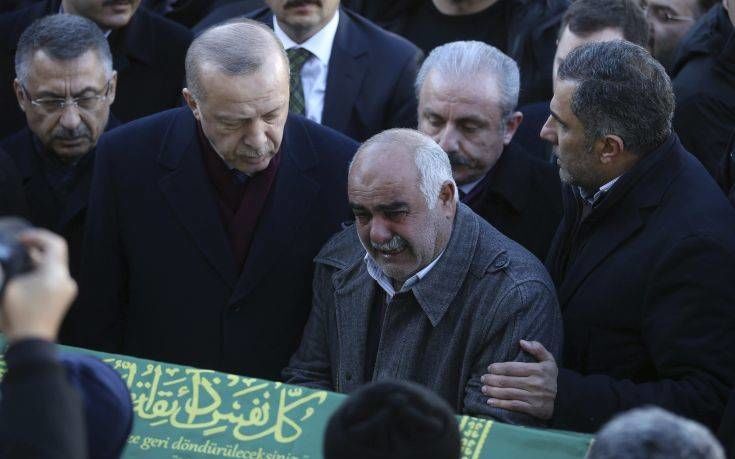 Μαυροφορεμένος και αμίλητος, ο Ταγίπ Ερντογάν παρευρέθη σε κηδεία θύματος από τα φονικά 6,8 ρίχτερ που έπληξαν το βράδυ της Παρασκευής την περιοχή και συμπαραστάθηκε στους συγγενείς του νεκρού.
