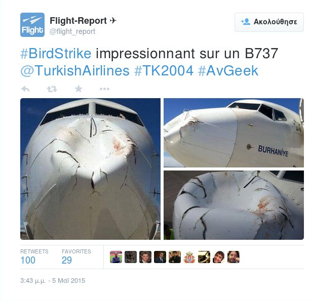 Το αεροσκάφος των τουρκικών αερογραμμών που εκτελούσε την πτήση Κωνσταντινούπολη – Νεβσεχίρ υπέστη τεράστιες ζημιές έπειτα από πρόσκρουση με ένα τεράστιο πτηνό.
