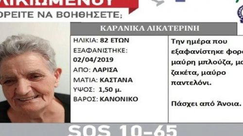 Πρόκειται για την Αικατερίνη Καρανίκα, 82 ετών, τα ίχνη της οποίας χάθηκαν στις 2 Απριλίου.